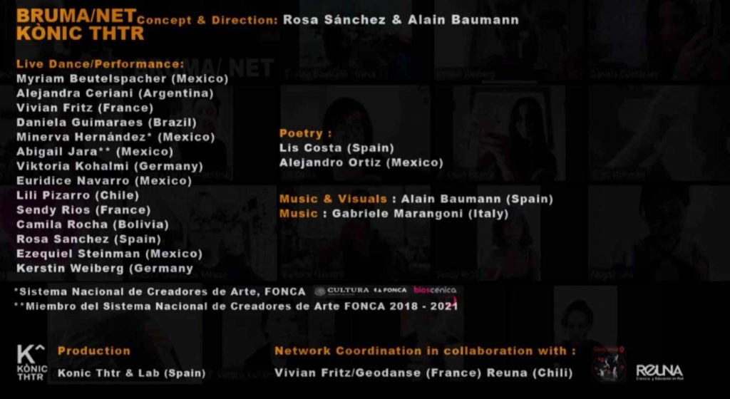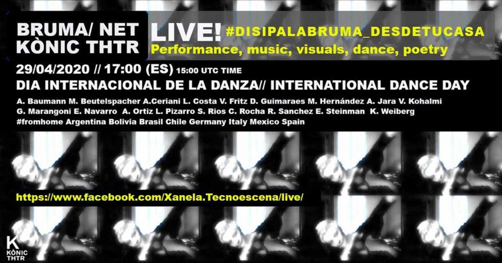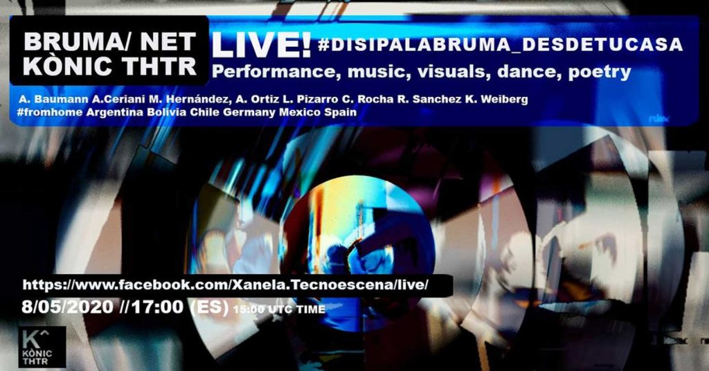 Participación en una serie de live stream performance bajo el concepto de Bruma/Net, a invitación de Kónic Thtr, de Barcelona, a un grupo de artistas de diferentes países, a propósito y en respuesta a la pandemia y las nuevas formas de relación y construcción de obras para la pantalla, en un cuerpo colectivo que se mueve en tiempo real.