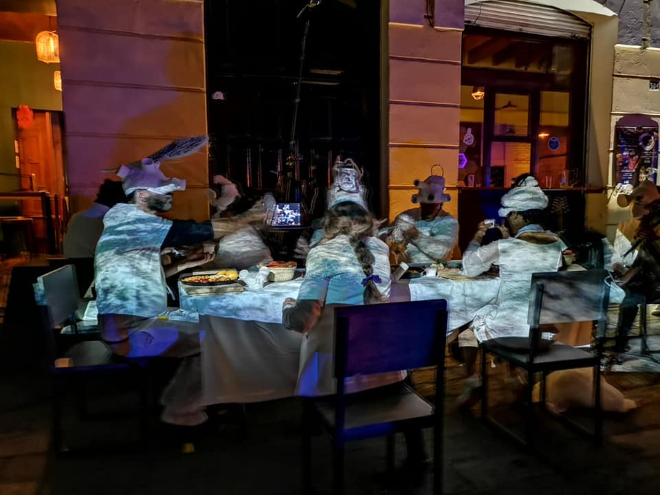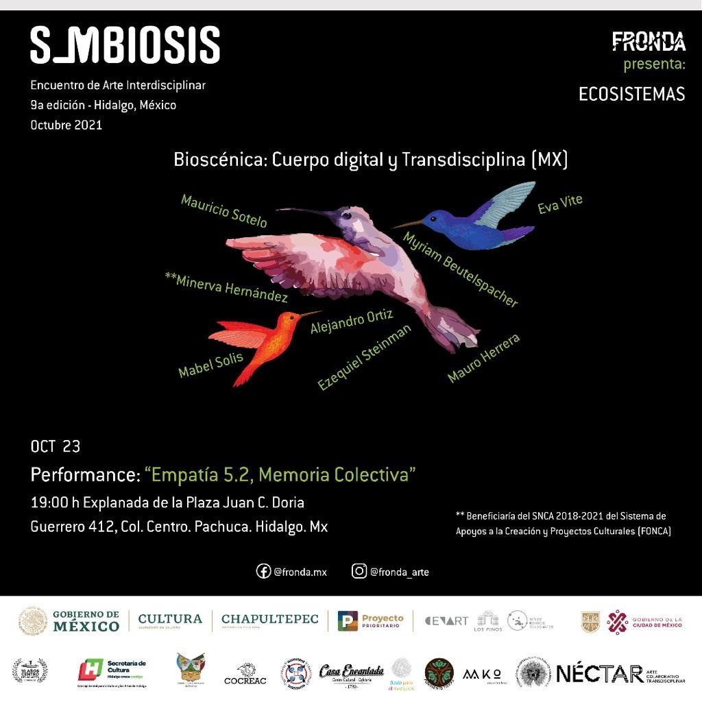 Alrededor de la mesa como un dispositivo híbrido, que lo mismo es el centro del mundo que la ventana al delirio colectivo, en un ritual cuyo propósito es la recuperación de la memoria de la tribu, en un banquete donde los cuerpos se nutren entre sí, se apuesta por la empatía como esencia vital para la supervivencia de la especie. Empatía 5.2 / Memoria colectiva, está diseñada para realizarse en un sitio específico y adaptarse, a partir de elementos móviles y con base en el concepto de dislocación de la mirada (investigación original de Minerva H. Trejo), con el uso de cascos analógicos que parten la vista del performer (y del mismo público, al compartirlos después) y con ello, hackean el cerebro en busca de nuevas realidades y estados alterados de conciencia. Performance, música en vivo, poesía y micromapping en tiempo real.