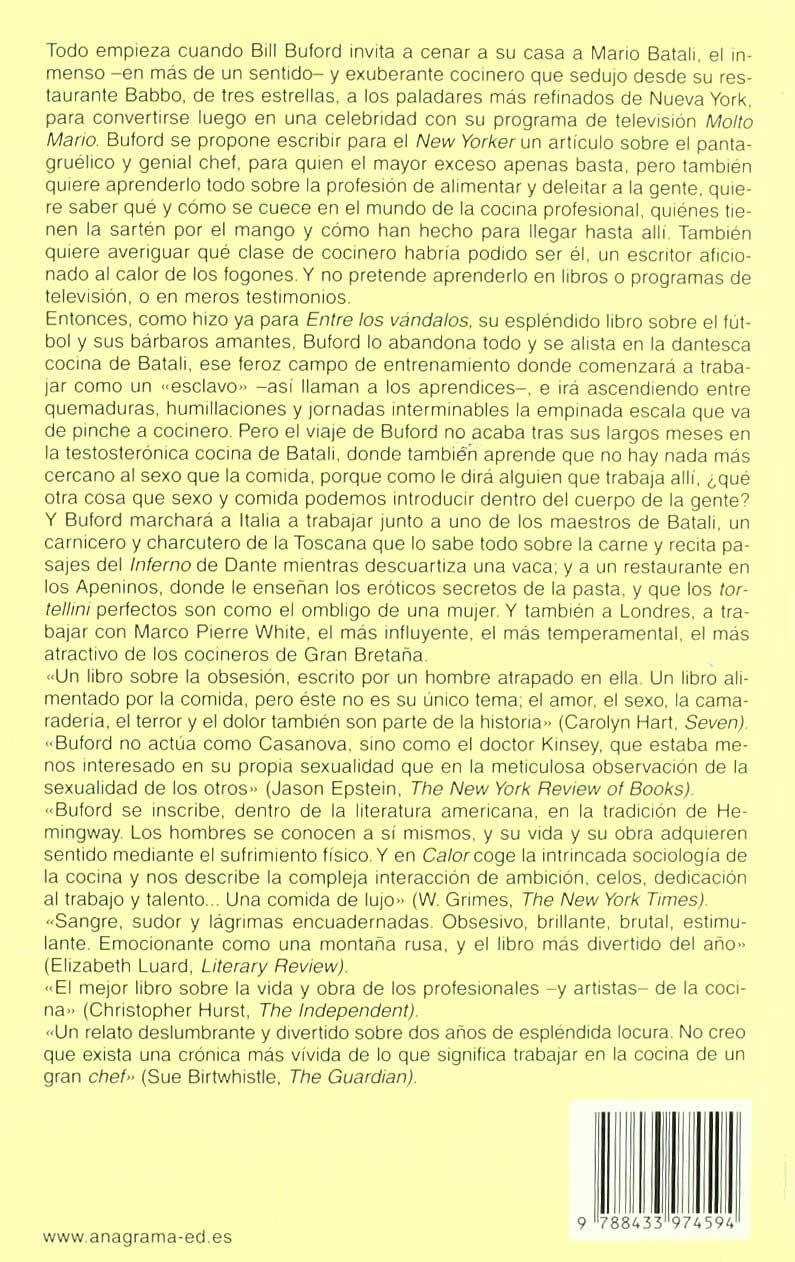 Hace aproximadamente un año, pude leer un libro que cambió mi percepción de la literatura gastronómica, me refiero a Heath, de Bill Buford, una crónica-novela-reportaje sobre Mario Batali y sus restaurantes en Nueva York. Buford, experimentado periodista del New Yorker, quería atacar desde adentro la construcción del mito viviente en que se ha convertido Batali, descubrir desde la cocina misma todos sus secretos. Y logró, merced a una negociación ardua con el propio chef, entrar de asistente a uno de sus restaurantes. Sobra decir que la iniciación de Buford es como la de Castaneda en la cocina de don Juan Matus, los secretos del conocimiento ancestral se van develando poco a poco, página a página.